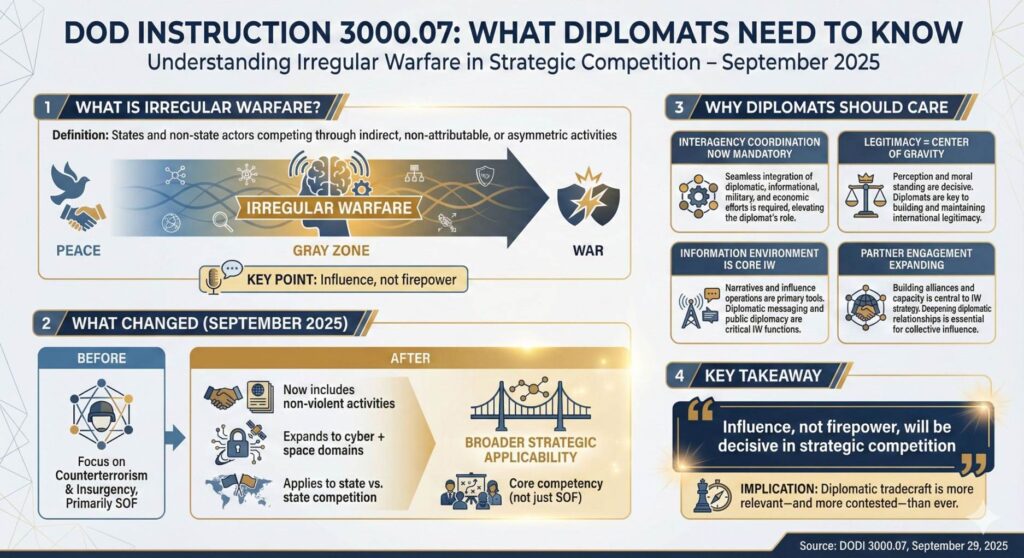 The Department of War’s new Irregular Warfare instruction (DODI 3000.07) redefines the U.S. approach to great power competition by institutionalizing a response to “gray zone” methods – such as proxy support, disinformation, economic pressure, cyber operations, and influence campaigns – used by our adversaries. This policy mandates closer interagency coordination for diplomats, shifting the strategic focus from conventional firepower to a contest of influence centered on eroding the legitimacy of our adversaries and strengthening the political will of our partners. Ultimately, the instruction signals that influence is now the decisive factor in international security, making diplomatic tradecraft more vital and more intertwined with military operations than ever before. [Italics and underline are my own, for emphasis…DJC]